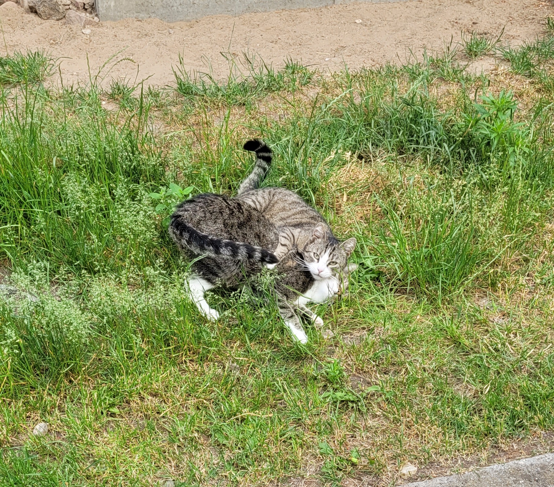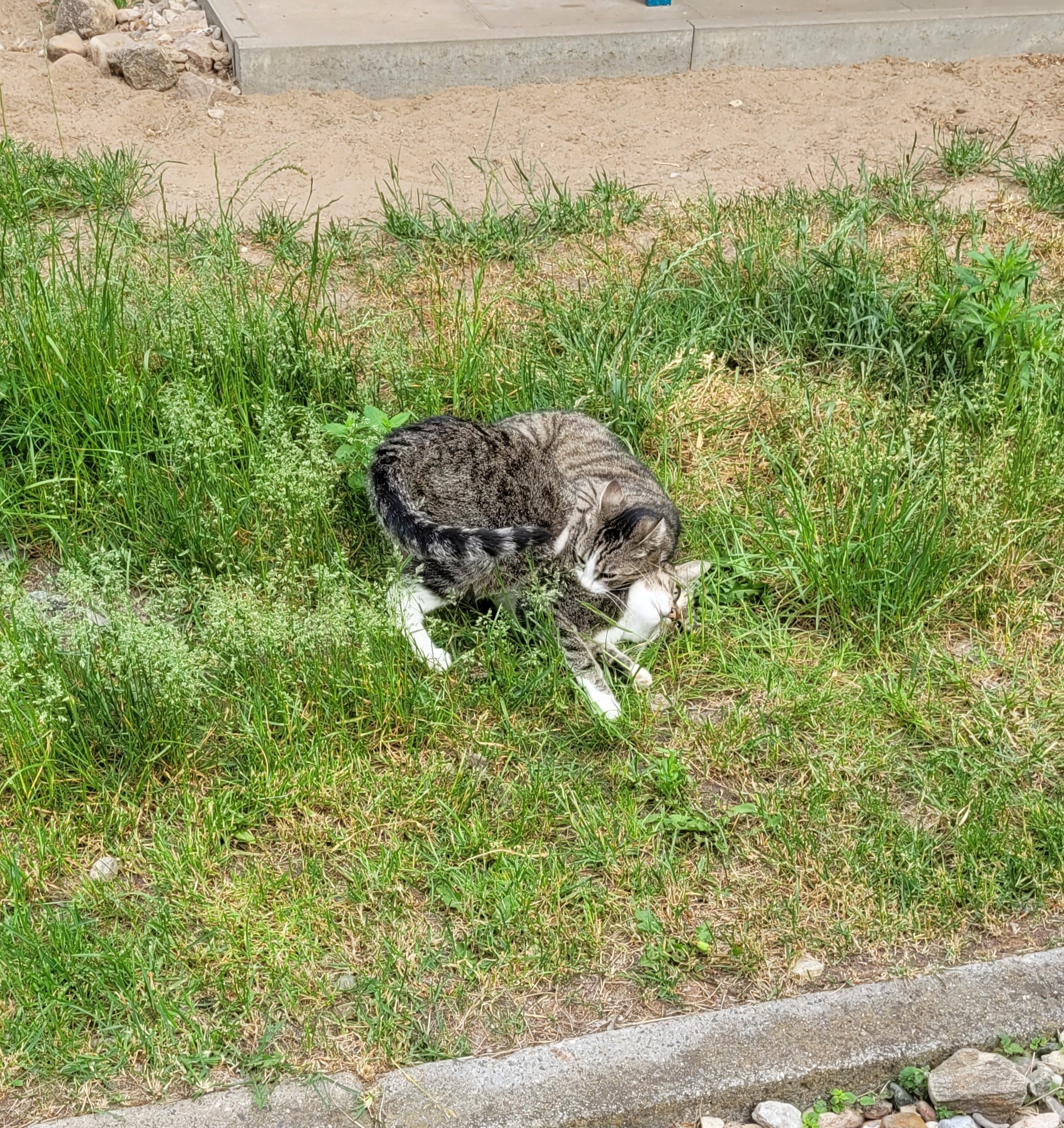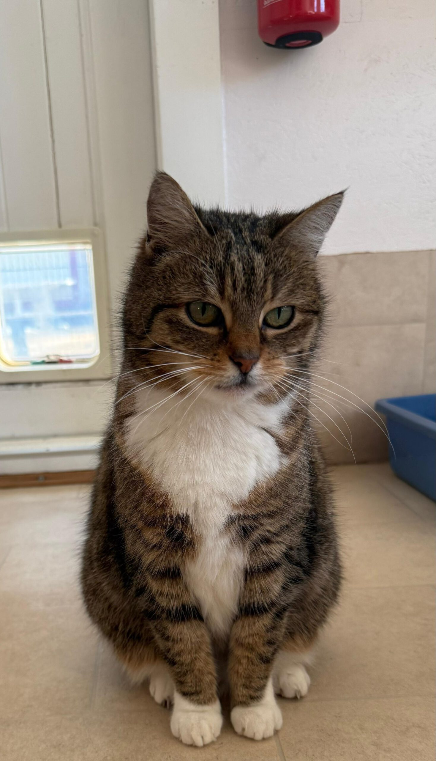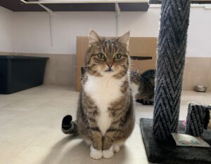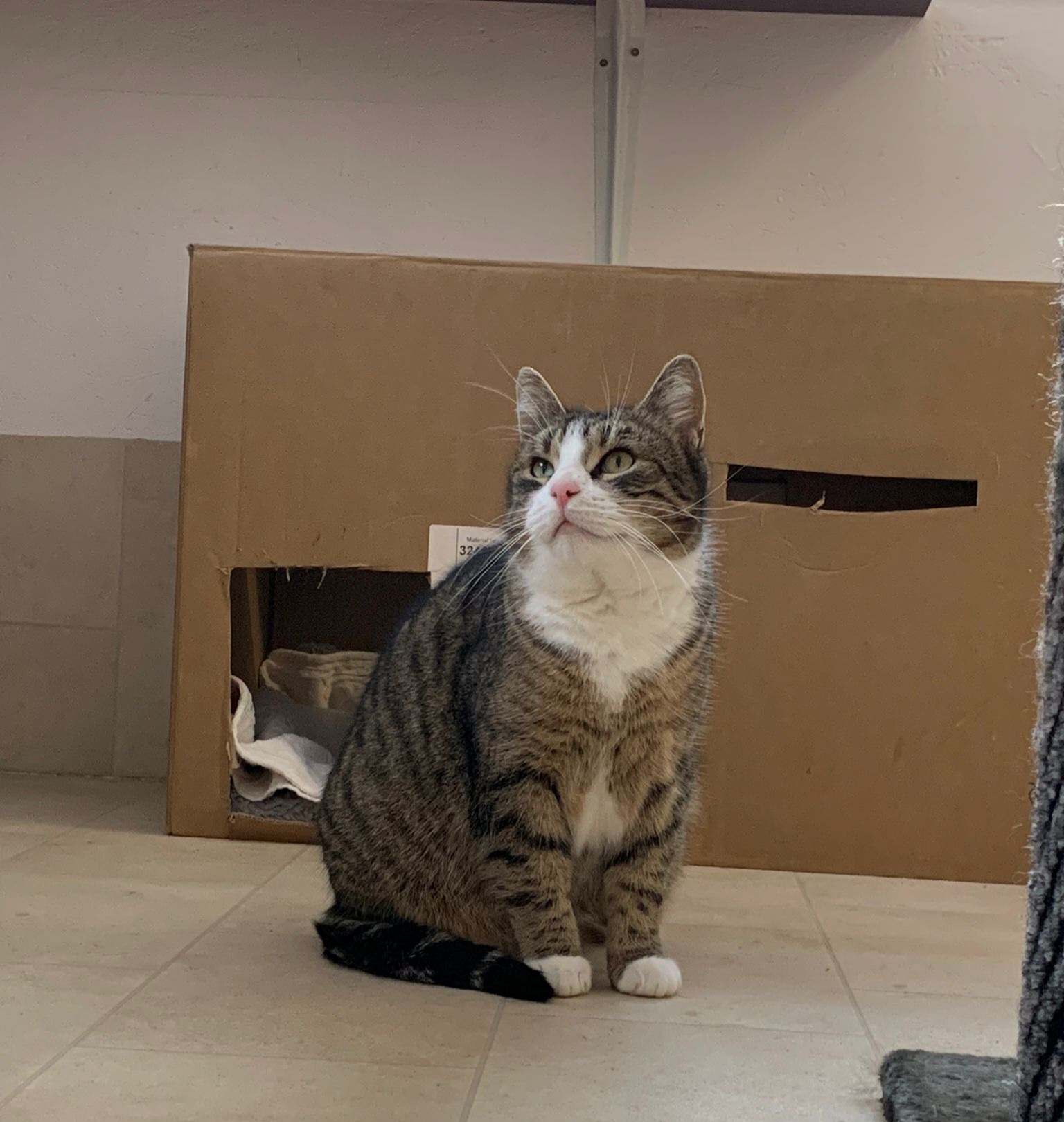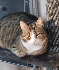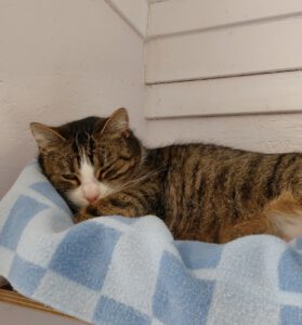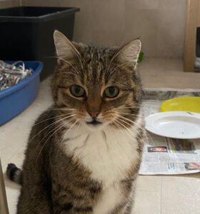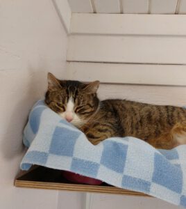 In der Zwischenzeit wird „Manager-Kater“ Kenji hier, der mit dem frechen Blick da und mindestens genauso zurückhaltend und schüchtern wie ich, einen Menschen davon überzeugen, eine Nachricht zu schreiben, um im Fernsehen darauf hinzuweisen, dass wir ein neues Zuhause suchen. Sag irgendwas, was Manager so sagen, keine Ahnung, Termine Termine, überleg dir was und überwinde mal deine Schüchternheit, ok? Gut!